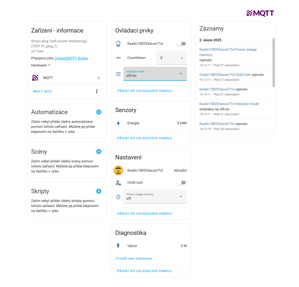 Po úspěšném připojení Zigbee2MQTT automaticky přidá zásuvka do Home Assistant.